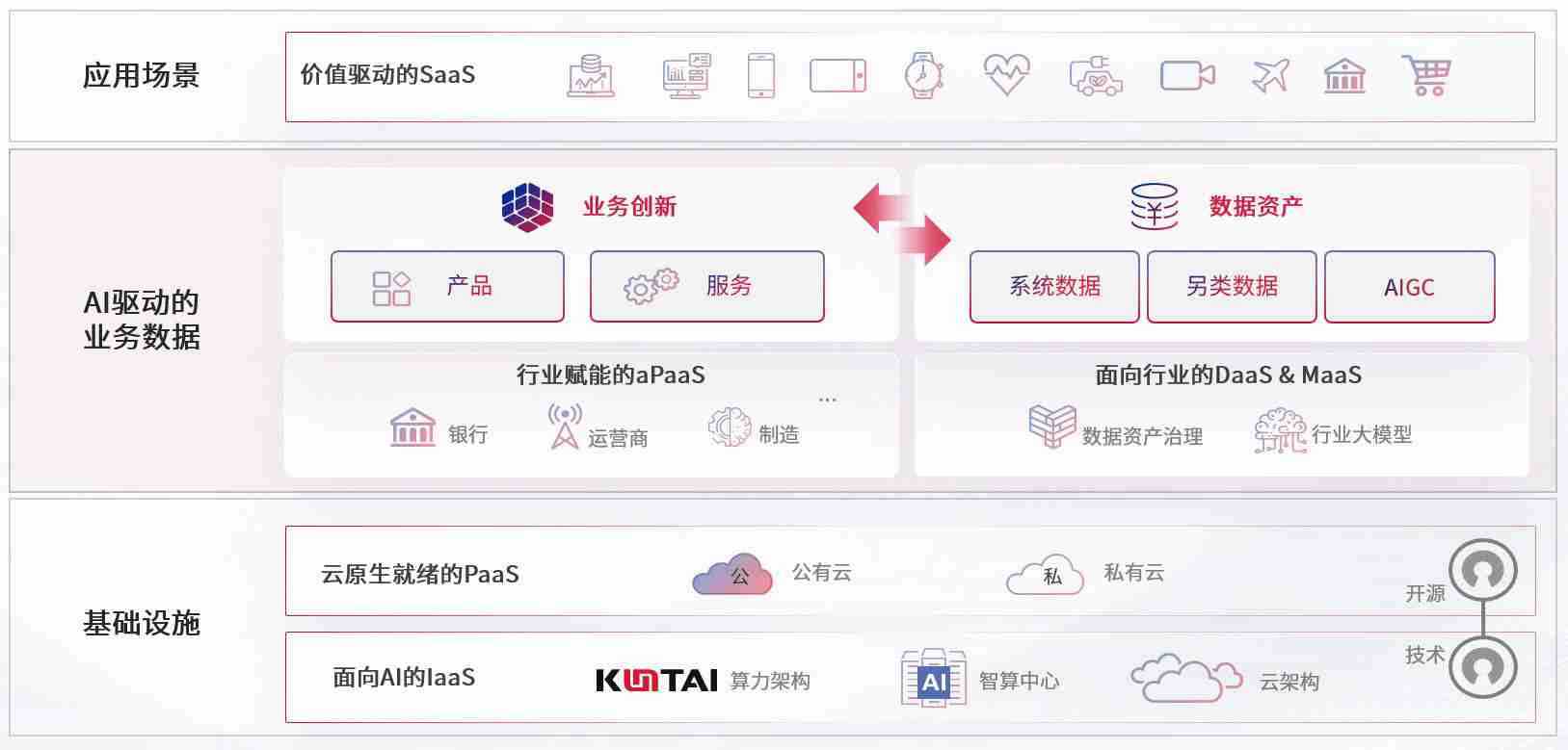 在基础设施层面,,,,基于商业或开源的云原生就绪开发工具与技术组件(PaaS)和面向AI的底层公共基础设施资源(IaaS),,将共同支撑企业完成数字化转型